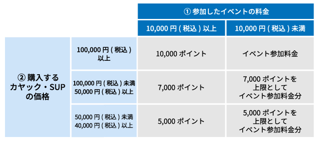 クーポンの額面は、①参加したイベントの料金、②購入するカヤック・SUPの価格で決まります。詳しくは以下の表をご確認ください。