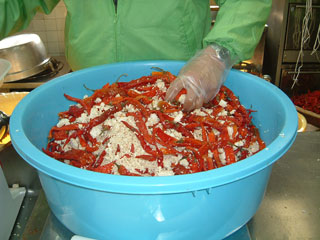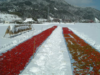 秋に収穫された「姫とうがらし」を塩漬けし、大寒の頃に雪の上でさらす「寒ざらし」を行います。真っ赤な唐辛子を真っ白な雪の上に並べるこの「寒ざらし」は、鏡野町の冬の風物詩としてすっかり定着しています。雪原にさらすことで、塩抜き・アク抜きができ、さらに凍結することで外皮がやわらかくなります。そうして塩抜きができた唐辛子とコシヒカリの米麹を混ぜ合わせ、3年間の熟成醗酵期間を経て出来上がったペーストが、すべての加工品の原材料になります。このペーストに、昆布だし等の調味料を加えて液状化したものが「辛美人とうがらし醤油〈赤・青〉」です。青の方が少し辛く、香りがつよいのが特徴です。