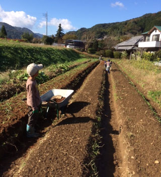 東京の都市再開発が始まった地域に住んでいた私たちは、日に日に変わりゆく町の変化に疑問を感じ、たびたび訪れていた海の綺麗な静岡に移住することにしました。そこで出会ったおじいちゃん、おばあちゃんの元気な姿と、いただいた有機野菜の美味しさと、それをもりもり食べる我が子の姿を見て感動! 有機野菜の農業を試み始めました。2013年、5反半(約5,500平方メートル)の土地を改善しながら畑を作り、無農薬・無化学肥料の野菜の栽培・販売を本格的に開始しました。現在は1町歩(約10,000平方メートル)の畑や田んぼで、野菜だけでなくお米や小麦も栽培しています。