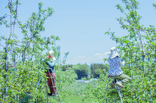 おいしいりんごをお届けするために完熟収穫をします。おいしさの指標である完熟状態での収穫を優先し、1個1個完熟状態を確認しながら収穫しています。