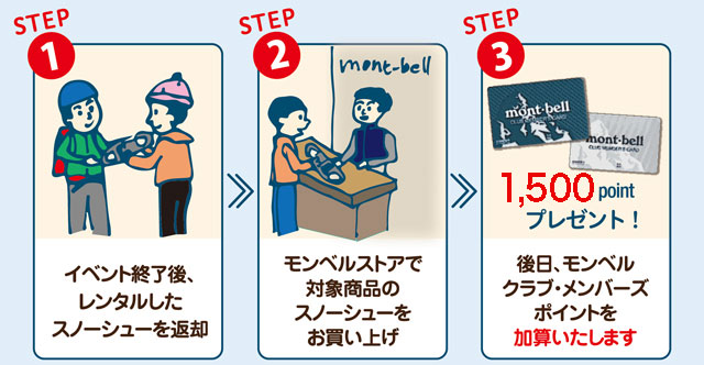 モンベルフレンドショップが主催するスノーシューツアーやレンタルをご利用いただいたモンベルクラブ会員さまに、対象のスノーシューご購入後に利用できる「ポイントバッククーポン」をもれなくプレゼント! フレンドエリアの素晴らしいスノーフィールドでスノーシューを楽しんで、お得にスノーシューをはじめませんか。