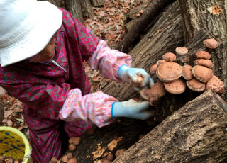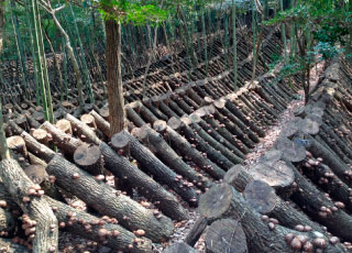 当園のほだ木はクヌギやコナラを中心に主に50年生ほどの大径木を使用しており、山中で長い時間をかけて駒菌を熟成させます。広葉樹の森林の、木漏れ日のさす環境でじっくりと育った椎茸は、肉厚で歯ごたえもよく、全国乾椎茸品評会で5年連続金賞をとるなど高く評価されています。