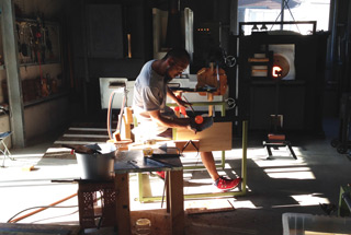 宙(ちゅう)吹きガラスという技法は、目に見えない微妙な温度差を体で感じる「繊細さ」、完成するまで休むことができない体力的な「持久力」、柔らかいガラスの動きに合わせる「反射神経」、重力や遠心力、色や形の違いから生じる膨張率や歪みの違いを理論的に考えながら進めて行く「集中力」が必要とされます。ガラスを扱うことは、「心」で考え「体」で感じる事の大切さを教えてくれます。そうしてでき上がった作品達は、様々な人達と出会うきっかけをもたらしてくれます。新しい出会いは、自分にとって作品を創る大きな目的であり楽しみです。「気」の合った仲間達と話をすることが自分自身を活性化させ楽しんで生きる原動力となり、それをまた作品へと転換させられるよう心がけています。