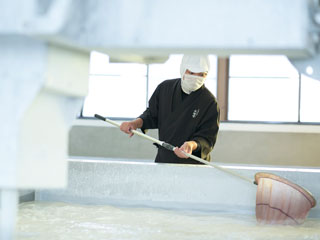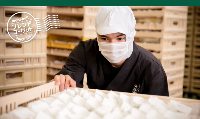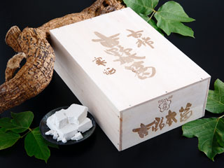 吉野本葛の原料となる葛の根は、葉の枯れ落ちた冬期に山へ入り、一つ一つ手で掘り起こして採取しています。採取した葛根を潰して澱粉を取り出し、何度も水に晒しながら、灰汁と不純物を取り除き、純白の吉野本葛へと精製していきます。この製法は江戸後期より受け継がれた「吉野晒し」という製法で、伝統の味を頑なに守り続けています。