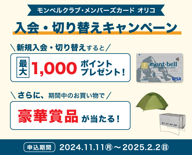 ウェブサイトからモンベルクラブ・メンバーズカード オリコにお申し込みいただいた方限定のキャンペーンを実施中! 新規ご入会または一般カードからのお切り替えで、モンベルポイントを500ポイントプレゼント。マイ月リボの設定で500ポイント、合計で最大1,000ポイントをプレゼントします。