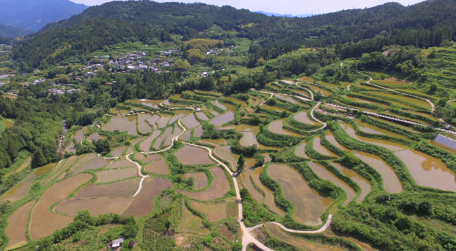 高知県本山町は、四国の中央に位置し、北に石鎚(いしづち)山地、南に剣(つるぎ)山地といった1,000m級の高い山々に囲まれた盆地です。町の約90%は山林で、山々は豊富な水を蓄積し、各地から湧き出す清澄な水によって幾多の谷川が形成されています。水田は、この谷川を水源として標高約250mから800mの間の急峻な土地に切り開かれ、等高線に沿って湾曲した昔ながらの棚田を形成しています。