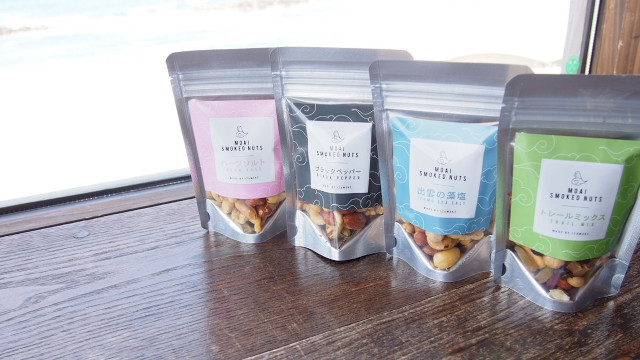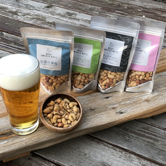8種類のナッツを島根県産のサクラを粗く削ったチップで燻製した、「出雲の藻塩」、「出雲のハーブソルト」、「ブラックペッパー」、「トレイルミックス(ナッツとドライフルーツのミックス)」の4種類をそれぞれ食べきりサイズの50gでパッケージしました。