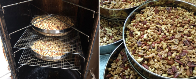 他の食材の薫りなどが移らないよう、ナッツ専用の燻製機で燻しています。より深い薫りづけと保存性を高めるため、雲藍オリジナルの製法として、2時間燻してから2時間冷ます工程を3回繰り返し、合計12時間をかけて製造しています。