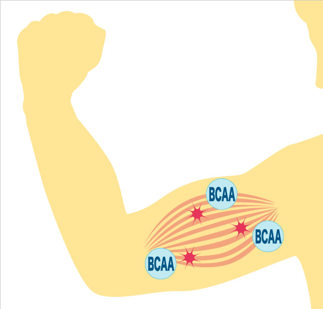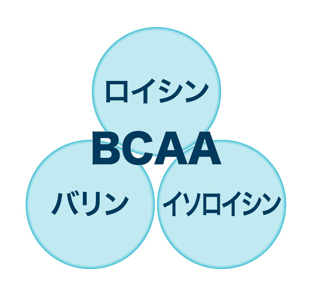 BCAA(= Branched Chain Amino Acids)とは、体内で作り出すことができない9種類の必須アミノ酸のうち、筋肉を構成している割合が高い3つのアミノ酸の総称。筋肉痛を防ぎ、集中力の維持をサポートし、筋肉の修復を促します。
