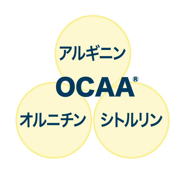 OCAA®(= Ornithine Cycle Amino Acids)とは、アルギニン、オルニチン、シトルリンという、疲労回復に効果を発揮する3つのアミノ酸の総称。疲労物質を分解し、血流を良くし、筋肉の修復・成長を助けます。