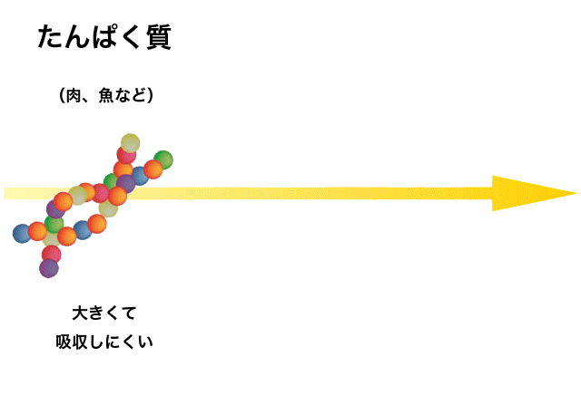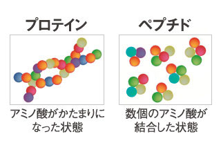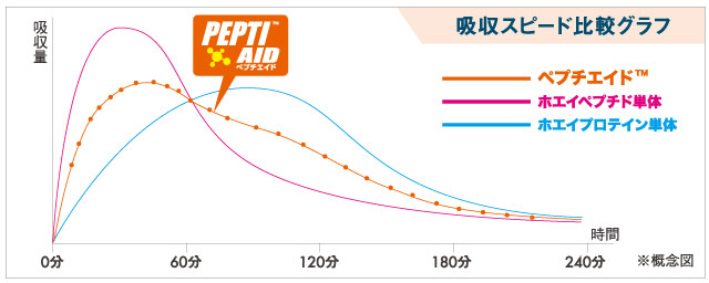 たんぱく質はそのままの形では吸収するのに4~5時間かかってしまい、即効性がありませんが、ペプチエイド®は乳製品由来のたんぱく質を、吸収しやすいペプチドにまで分解。速効性のあるペプチドとホエイプロテインを合わせることで、素早い吸収と効果の持続性を両立しました。