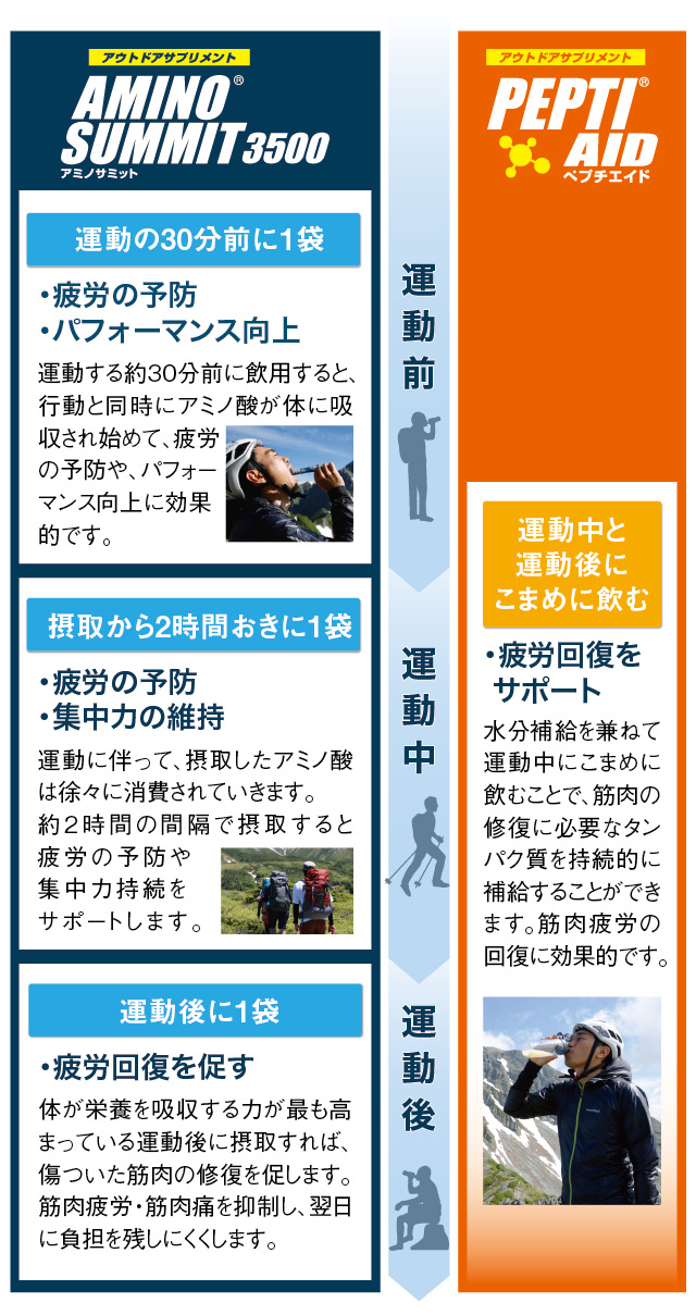 予防に特化したアミノサミット®3500と、修復に特化したぺプチエイド®を合わせることで、より強い相乗効果も生まれます。ロングコースを歩くときや、翌日の疲労感を軽減したいとき、登山はもちろん自転車やカヤックなど、さまざまなシーンで使えるアウトドアサプリメントをぜひお試しください。