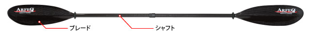 パドルはブレード(パドル両先端にある水を捉える部分)とシャフト(ブレードとブレードをつなぐ棒)で構成されています。ブレードやシャフトは、カーボンやファイバーグラスと樹脂を合わせた軽く、強い素材が使われることが多く、素材の特徴によりパドリングに違いが出ます。