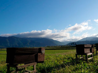 バトックウェーブの養蜂場は、滋賀県東近江市と甲賀市の広い地域に展開しています。東に標高1,000メートル級の鈴鹿山脈、西には愛知(えち)川・日野川が琵琶湖に流れ込むなど、幅広い特色を持つ自然豊かな地域です。山里で自由に飛び回る元気なミツバチが、ミネラル豊富な天然水で育ったさまざまな山の花から集めるはちみつは、花の香りと季節を感じることができる百花蜜です。滋賀県の豊かな自然を活かして、元気なミツバチを育てることを目指しています。
