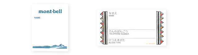 モンベルのキッズ・クロージングには、名前を書き込めるネームタグが裏側やポケット内部に付いています。 ネームタグは2種類が混在します。 Tシャツや小物などは品質ラベルに名前欄を設けています。 仕様上ネームタグが付いていない商品があります。