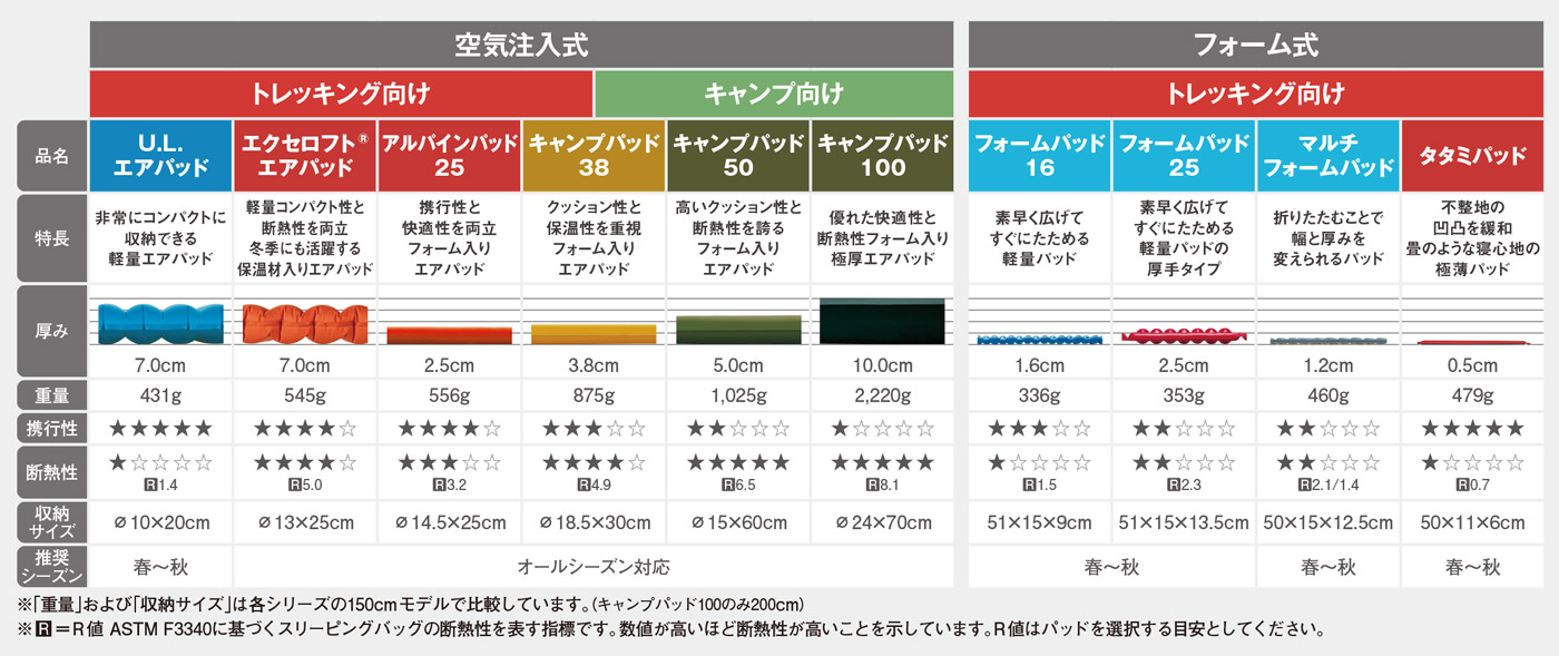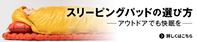 上記の表には、それぞれの商品の【価格】、【重量】、【収納サイズ】を表示しています。 ※重量はスタッフバッグを含む重量です。 ※表示サイズは、レギュラーモデルの数値で表しています。 ※「使用温度の目安」はスリーピングバッグ各モデルの快適温度を基準にしています。 エクスペディションからキャンピングまで、さまざまなニーズに合わせお選びいただけるスリーピングバッグをラインアップしています。使用する場所や季節に合った最適なモデルをお選びください。
