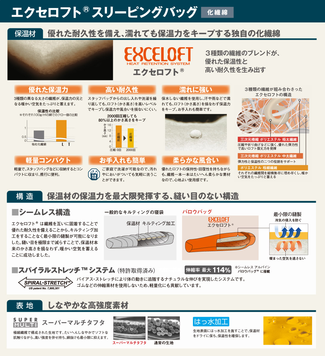 暖かく速乾性に優れた独自開発の化学繊維(エクセロフト)を中綿に使用したスリーピングバッグ。