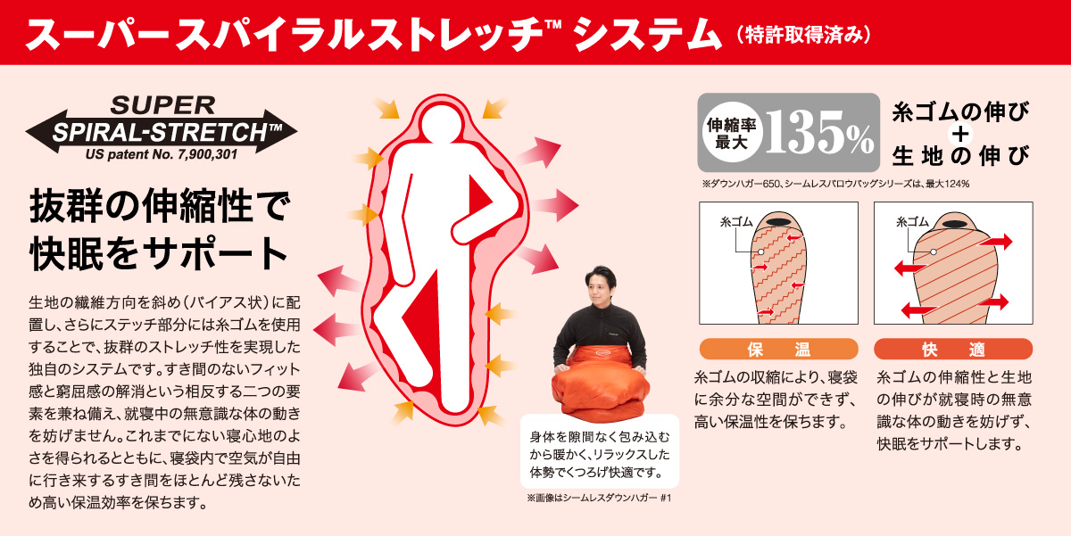 【スーパースパイラルストレッチ システム採用シリーズ】 ドライ シームレス ダウンハガー900(内側に搭載) シームレス ダウンハガー800(内側に搭載) シームレス ダウンハガー800 Women's(内側に搭載) シームレス ダウンハガー800 ハーフレングス(内側に搭載) シームレス ダウンハガー800 サーマルシーツ シームレス バロウバッグ(内側に搭載) ダウンハガー650