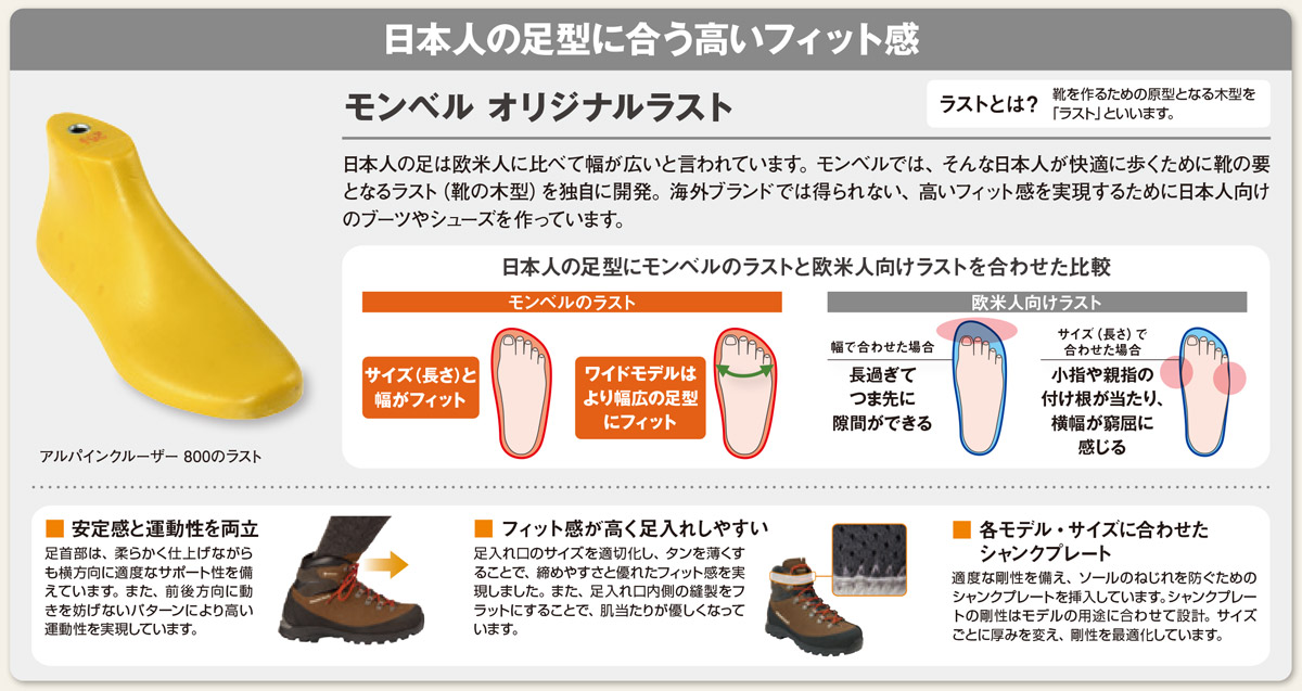 チャートの上に行くほどブーツの剛性やつま先の保温素材の耐久性が高く、岩場や重装備でも安定した歩行をサポートします。 モンベルでは、ハイキング、縦走、雪山登山、トレイルランニングなどさまざまな登山スタイルをカバーする豊富なラインアップをご用意しています。 それぞれの機能や特長を踏まえ、目的に適した1足をお選びください。