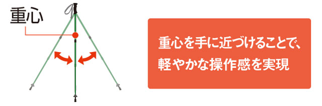 サイズ調節を上段と中段の接合部で行うことで、中段と下段の重なりを短くできるよう強度設計をしています。また、重心をできるだけ上に持っていけるように各シャフトの素材、径、肉厚を吟味し最適化を図っています。重心を手に近づけることができ、軽やかな操作感を実現しています。 ※U.L.フォールディングポール、2-Wayグリップを除く。