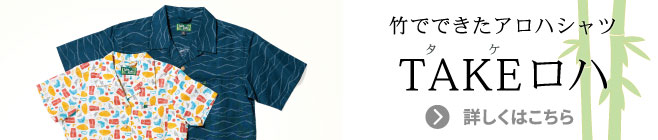 世界で初めて竹そのままの繊維を用いたアロハシャツ「TAKEロハ」。涼しくて環境にも優しいロングセラー商品です。