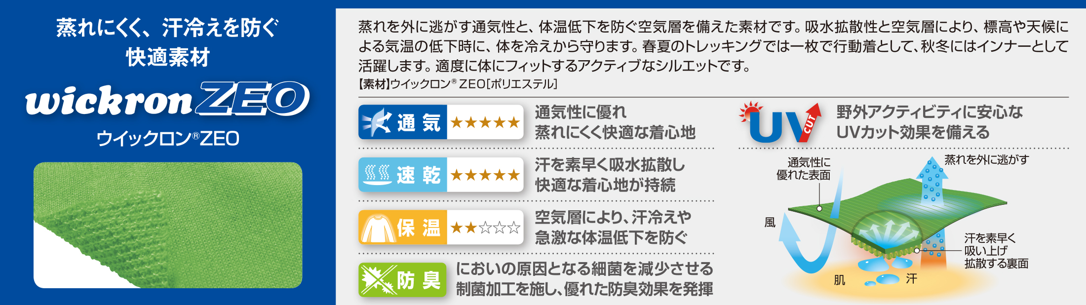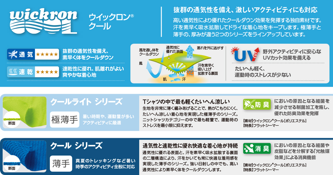 アウトドアで涼しく、快適に過ごすのに適した素材「ウイックロン」。アウトドアウエアの素材開発を独自に続けてきた、モンベル一押しの高機能素材をご紹介します。