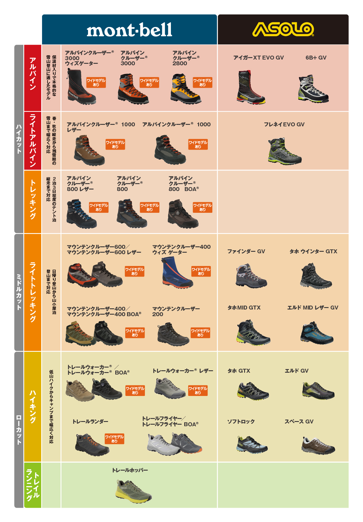 チャートの上に行くほどブーツの剛性やつま先の保温素材の耐久性が高く、岩場や重装備でも安定した歩行をサポートします。