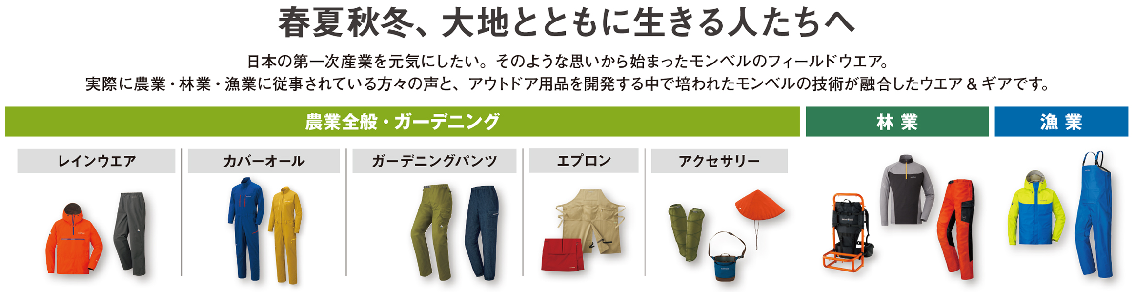 モンベル独自のノウハウを生かして作り上げた農業やガーデニングに適したウエアをご紹介します。フィールドウエアはこちら