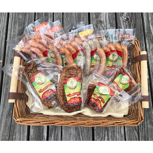 【内容量】あらびきソーセージ:2袋(133g×2)、黒こしょうソーセージ:1袋(133g×1)、チーズ入りソーセージ:1袋(133g×1)、ハーブソーセージ:1袋(133g×1)、えごまみそソーセージ:1袋(133g×1)、ロースハム:2袋(200g前後×2)、ベーコン:2袋(250g前後×2)