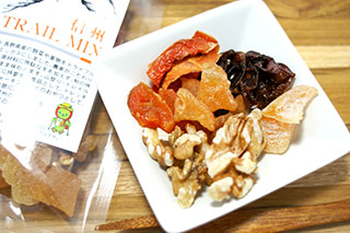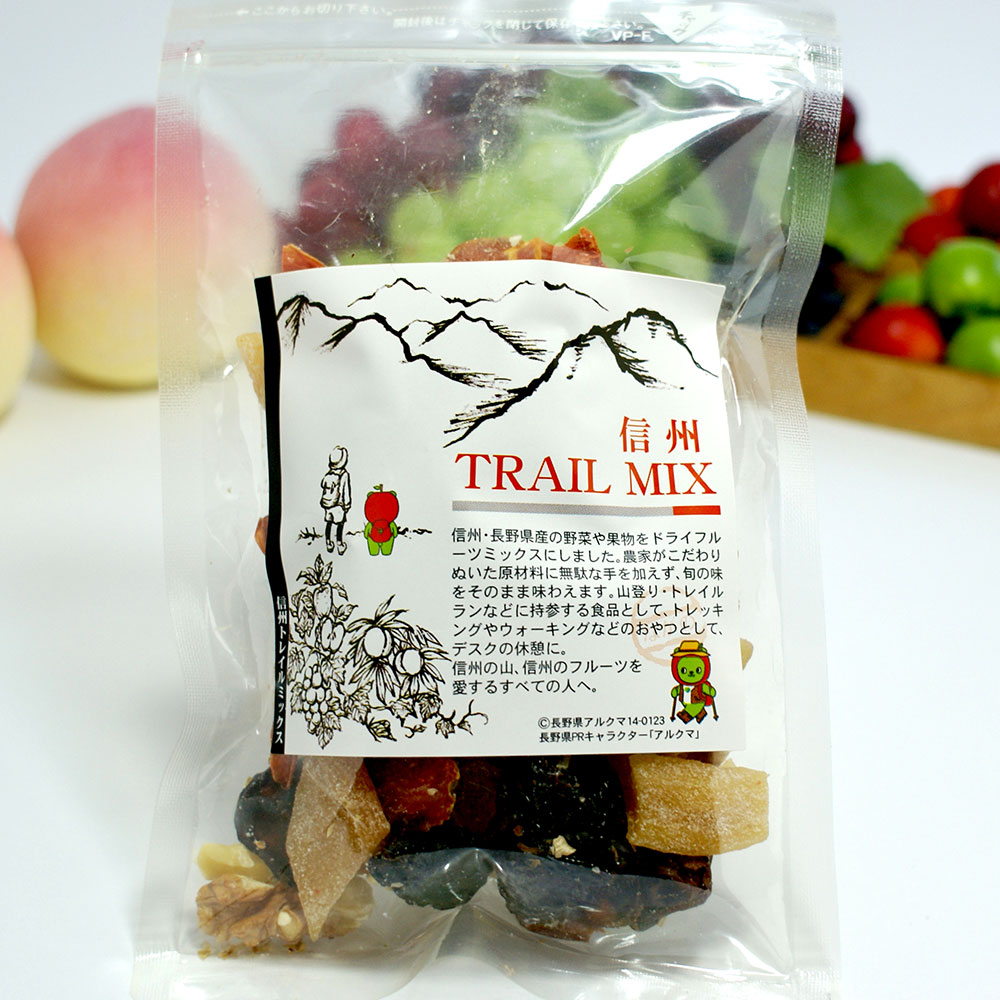 信州トレイルミックスは、「川中島白桃」やぶどうの「ナガノパープル」など長野県の代表的な果物がたっぷり詰まっています。登山やランニングなどの行動食として、仕事の合間や小腹がすいたときのおやつに、優しい果物の味をぜひお試しください。