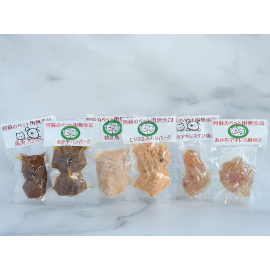 【内容量】410g(あか牛ハンバーグ80g・あか牛アキレス腱焼き50g・とりささみハンバーグ80g・焼き鳥70g・馬肉ハンバーグ80g・馬肉アキレス腱焼き50g)