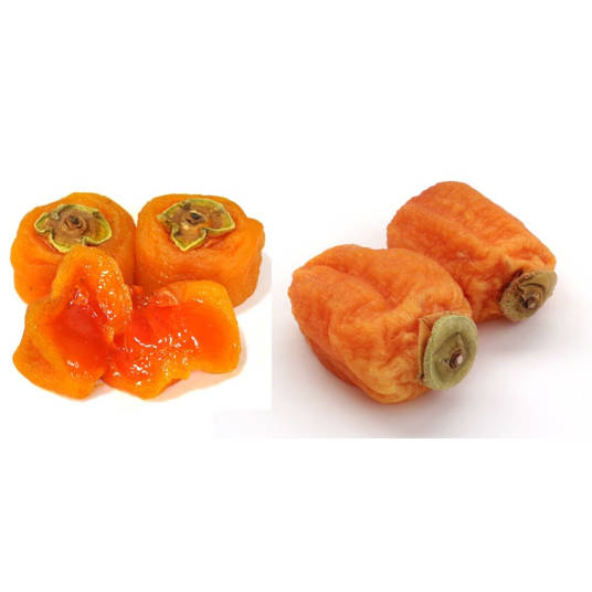 【あんぽ柿】原料のいずれも渋柿で、平核無柿(渋柿)は南アルプス市上宮地、百目柿は南アルプス市桃園、で栽培しています。あんぽ柿は、実の周囲は乾燥してやや固め、口に含むと中身がとろりと口に広がる食感が特徴です。平核無あんぽ柿は、口に含みやすいコンパクトな実が特徴で、食べやすさを求める方にはおすすめです。百目あんぽ柿は、1つ1つの実が大きいのが特徴です。ボリューム感を楽しみたい方にはおすすめです。