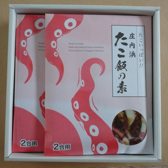 貴重な地だこをふんだんに使った「たこいっぱい! 庄内浜たこ飯の素(2合用)」。柔らかく食べやすいたこをたっぷり使い、満足いただける逸品に仕上げました。