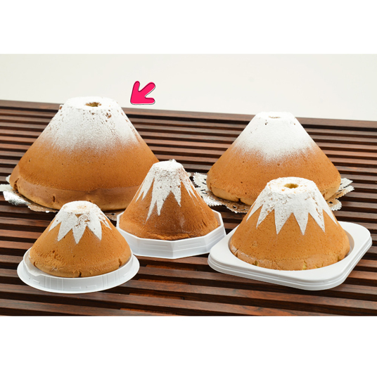 富士山の形をしたシフォンケーキ“ふじフォン”。厳選した地元産の素材にこだわり、そのままで十分に満足していただける味に仕上げました。ふんわりしっとり食感とやさしい甘さで、お子さまからご年配の方まで幅広く愛される味わいです。