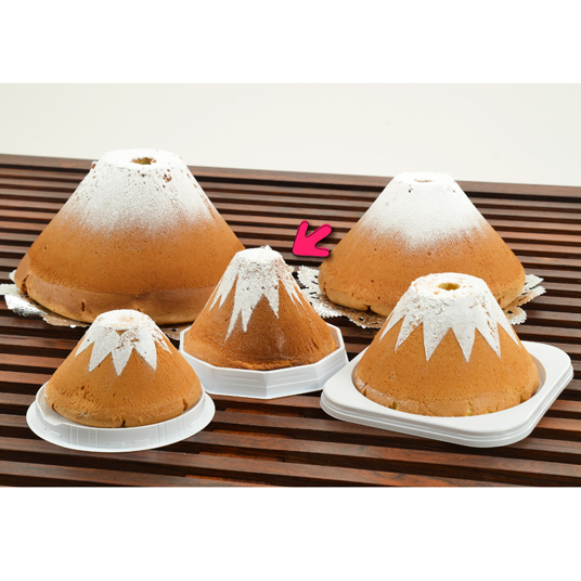 富士山の形をしたシフォンケーキ“ふじフォン”。厳選した地元産の素材にこだわり、そのままで十分に満足していただける味に仕上げました。ふんわりしっとり食感とやさしい甘さで、お子さまからご年配の方まで幅広く愛される味わいです。