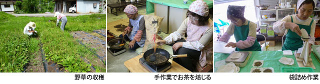 野草は変質しないよう、自然乾燥させてから保管し、梱包直前に機械でしっかりと乾燥させます。緑茶・麦・ハトムギは手で焙じ、お茶に適さない部分や異物は丁寧に取り除きます。それぞれの野草は手作業でブレンドし、1袋1袋梱包しています。