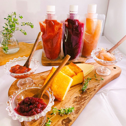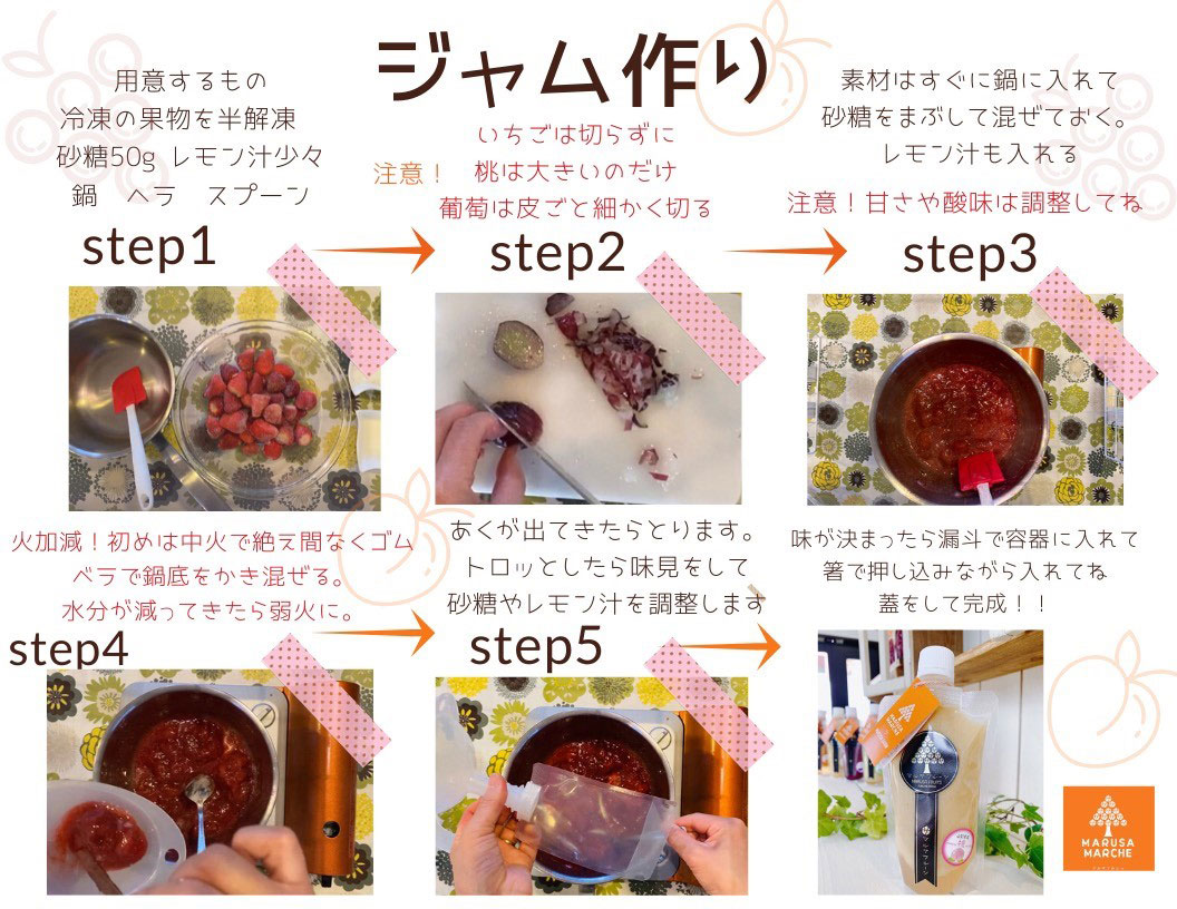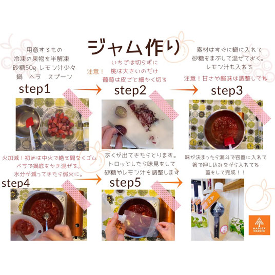 お家で用意していただく材料は、砂糖とレモン汁だけでお家で本格的なジャムが簡単に作れます。マルサマルシェオリジナルのレシピと、作ったジャムを保存するパックもセットになっています。さらに完成したジャムのサンプルも1本お届け。自分好みの甘さに調整してオリジナルのジャムを作ることができます。フルーツ王国山梨の新鮮な果物を使った楽しくておいしい体験キットは、プレゼントにもおすすめです。