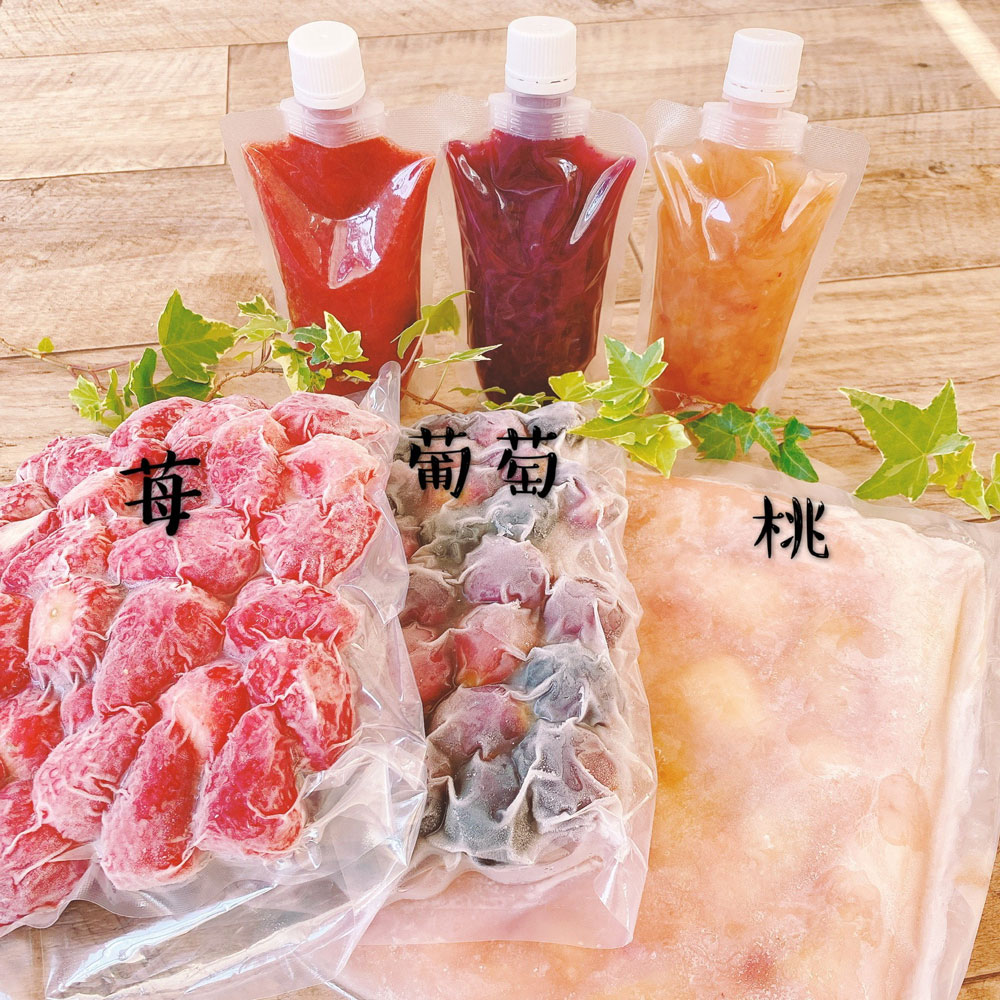 【内容量】山梨県産の3種類のフルーツ(例:イチゴ・モモ・ブドウ・キウイなどの季節のフルーツ)各300g(冷凍)、ジャム専用容器×3個、できあがりサンプル1本