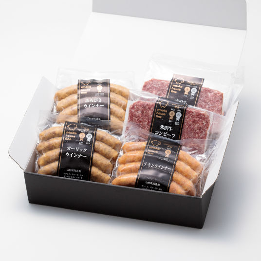 【内容量】あらびきウインナー110g、ガーリックウインナー110g、チキンウインナー110g、米沢牛コンビーフ50g×2