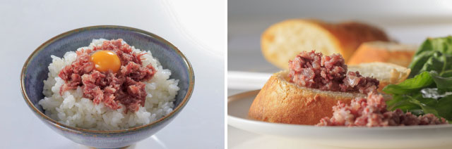 スモークハウスファインのコンビーフは、焼くと旨味が溶け出してしまうため、焼かずにそのままお召し上がりください。あつあつご飯に乗せても、バゲットに乗せてもおいしくお召し上がりいただけます。