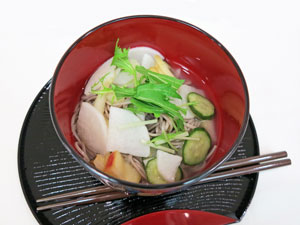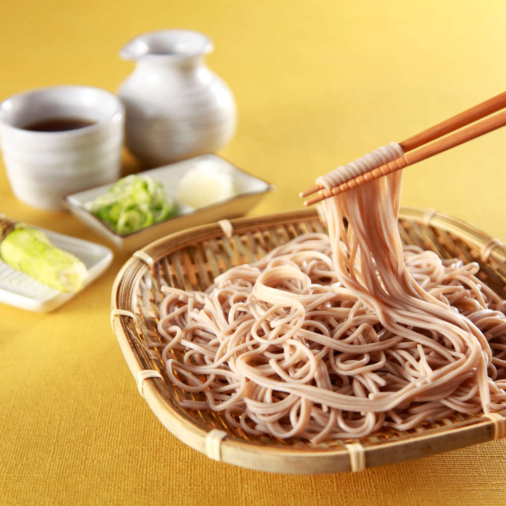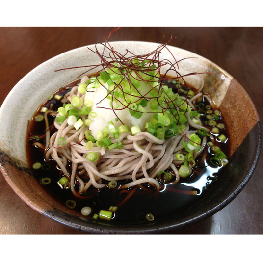 夏は冷たくして麺にお好みの薬味をのせてざるそばとして、冬は湯の中であたため直し、季節の具をのせてお召し上がりください。