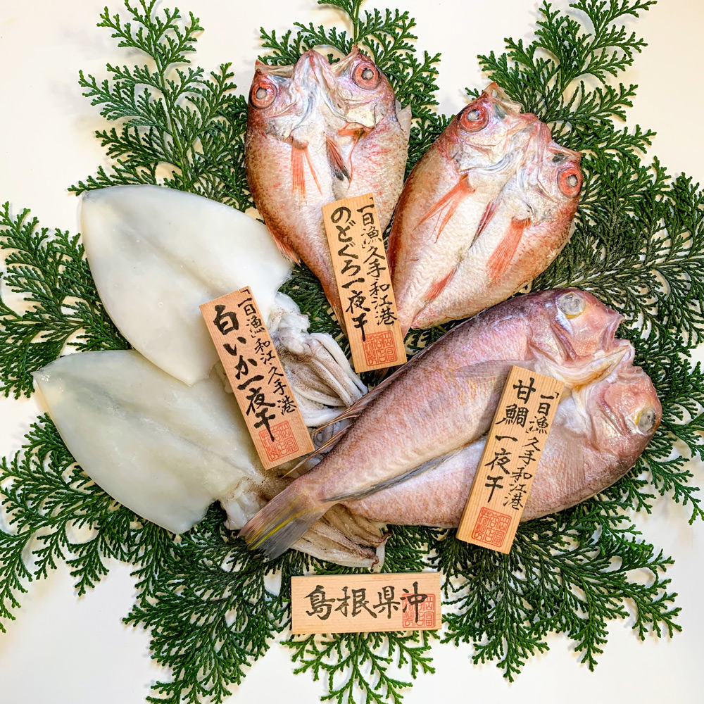 世界遺産「石見銀山」を誇る島根県大田市の特産品ブランド「おおだブランド」に認証された【甘鯛】【のどぐろ】【白いか】の一夜干3種を詰合せた豪華なセット。全国でも珍しい「一日漁」により鮮度の高いまま無添加ワンフローズン製法で加工しています。