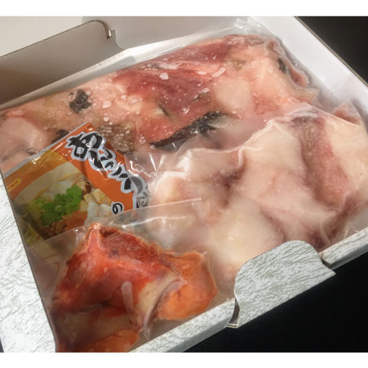 【素材】アンコウ(島根県沖産)、あんこう鍋のたれ(希釈用)80g×1【味噌(国内製造)、醤油、砂糖、しょうゆもろみ、食塩、米発酵調味料、昆布エキス、魚介エキス、酵母エキス、魚醤、調味料(アミノ酸等)、(原材料の一部に小麦、さば、大豆を含む)】