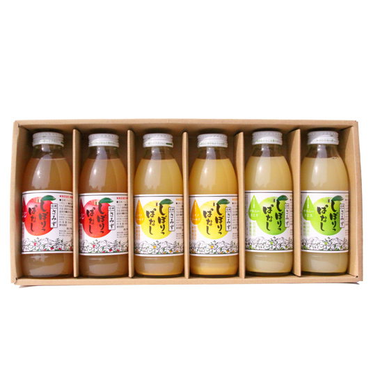 「サンふじ」「シナノゴールド」「グラニースミス」のりんごジュースのセット。「しぼりっぱなし」という名のとおり、無添加のりんごを丸ごとしぼった果汁100%のジュースです。