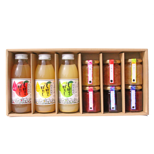 「サンふじ」「シナノゴールド」「グラニースミス」のりんごジュースと6種類のフルーツジャムのセットです。まるで果実をそのまま食べているような味わいが自慢です。贈答用にも最適なギフトボックス入り。