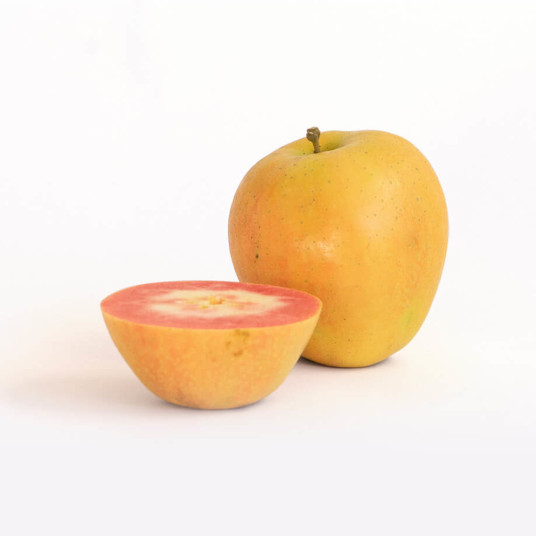 果皮は黄色に薄っすら果肉の赤色が透けて見え、果肉は桃色~赤色が混じり、広範囲で赤色が入ります。酸味が強めですが、さっぱりとした味わいのりんごです。7~12玉入り。