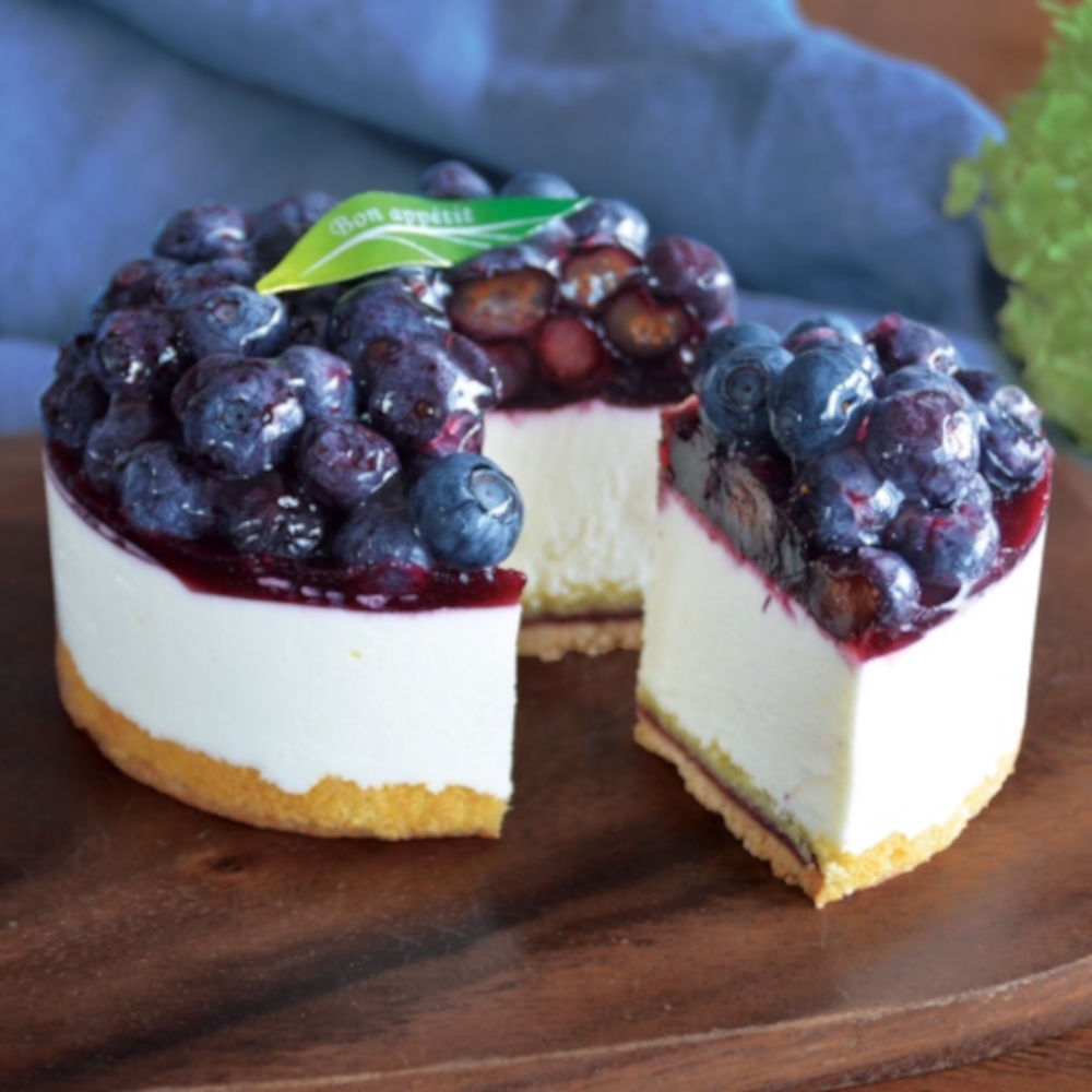 【素材】ブルーベリー、クリームチーズ、生クリーム、砂糖、卵、ヨーグルト、小麦粉、バター、ゼラチン、洋酒、レモン