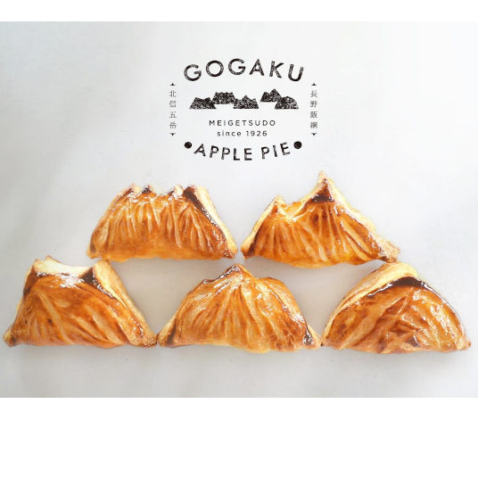 山のアップルパイGOGAKUは、長野県飯綱町で栽培される50品種ものりんごを季節で味わってほしいという想いからできた商品です。形にもこだわり飯綱町から見渡せる北信五岳という5つの山の形にしました。