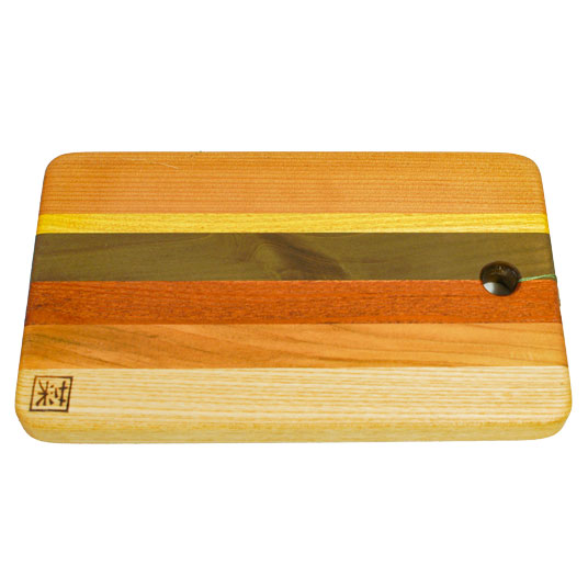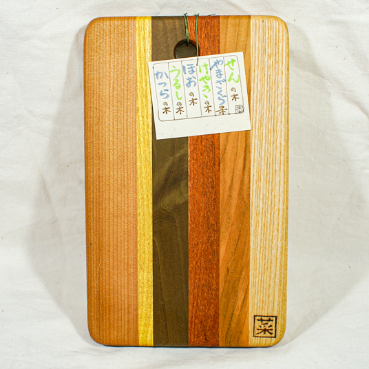 卓上でパンやフルーツを切る時に重宝する「寄木カットボード」です。使用している樹種名がわかる手書きの名札つき。木々のそれぞれ原色を生かした優しい配色のカットボードからは、里山の豊かな多様性が楽しめます。