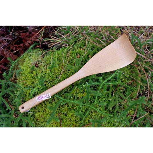 先の曲がりが特徴的な菜やオリジナルのヤマザクラ製ターナーです。テフロン加工をしたフライパンなども傷めず、かつ安心・安全なヤマザクラ材のブロックから切り出して作っています。